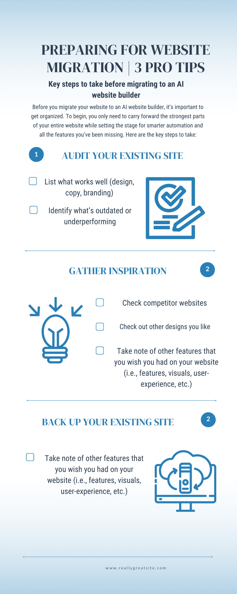 Before you migrate your website to an AI website builder, it’s important to get organized. Migrating from a traditional website builder to an AI builder like B12 doesn’t mean starting over.