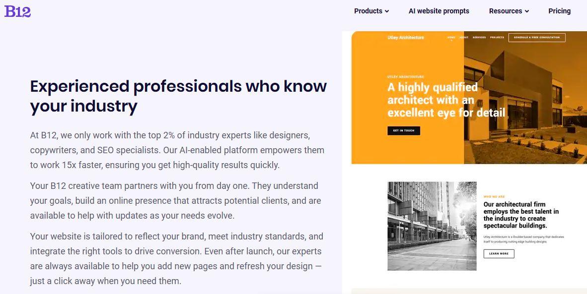 Some AI website generators, such as B12, allow you to work with professional copywriters and web developers to refine your site. While you can handle this step yourself, bringing in an expert can significantly reduce editing time and help you reach a more polished result faster.