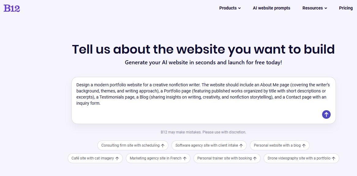 - Why this B12 AI website builder stands out: B12 combines AI speed with human-quality output and business functionality. It also offers prompt website gallery templates for industry-specific sites, letting you fine-tune every section or get support from B12’s creative services team.